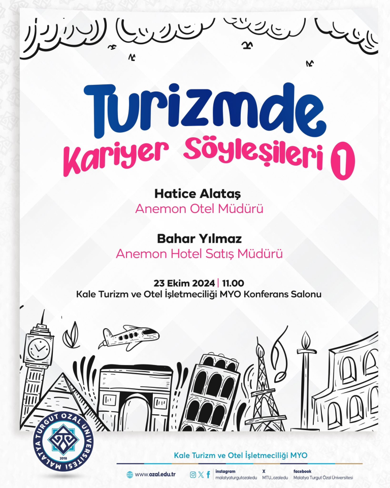 Kariyer Planlama dersi kapsamında Yüksekokulumuz Konferans Salonunda 22.10.2024 Çarşamba günü saat 11:00’da “Turizmde Kariyer Söyleşisi” düzenlenecektir. Tüm öğrencilerimizin katılımı rica olunur.