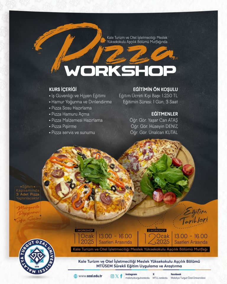 Malatya Turgut Özal Üniversitesi Kale Turizm ve Otel İşletmeciliği Meslek Yüksekokulu Aşçılık Bölümü Mutfağımızda verilecek olan Temel Pizza Yapım Teknikleri eğitimimize bekleriz.