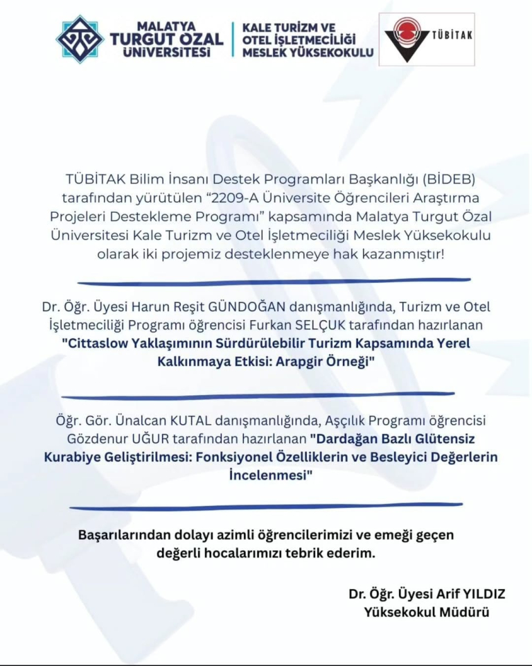 📌Malatya Turgut Özal Üniversitesi Kale Turizm ve Otel İşletmeciliği Meslek Yüksekokulu olarak iki projemiz desteklenmeye hak kazanmıştır! 🎉